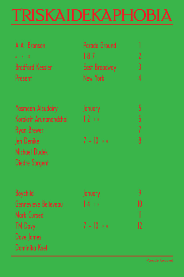 1/12: Yasmeen Alsudairy, Korakrit Arunanondchai, Ryan Brewer, Jen DeNike, Michael Dudeck, Deirdre Sargent