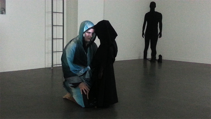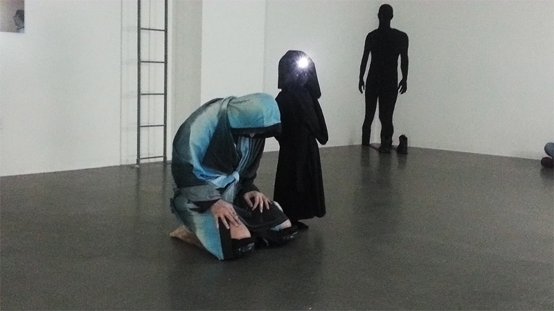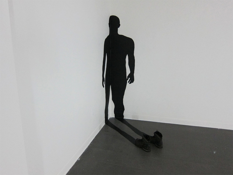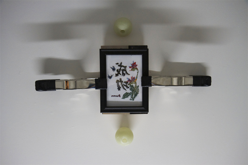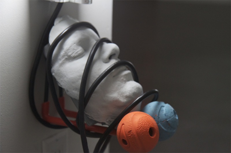 embroidery by Mom, "The Animal That Therefore I Am" by Jacques Derrida, "Vampires" by Jalal Toufic, plywood, spring clamps, glow in the dark dog toys