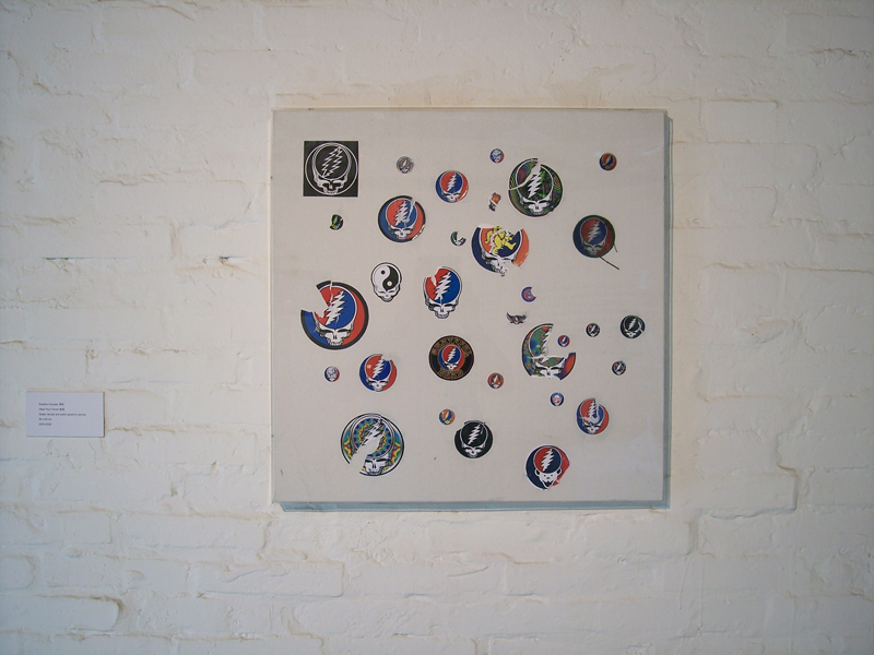 Stolen decals and patch glued to canvas, plexi-glass