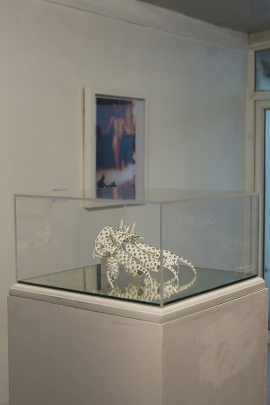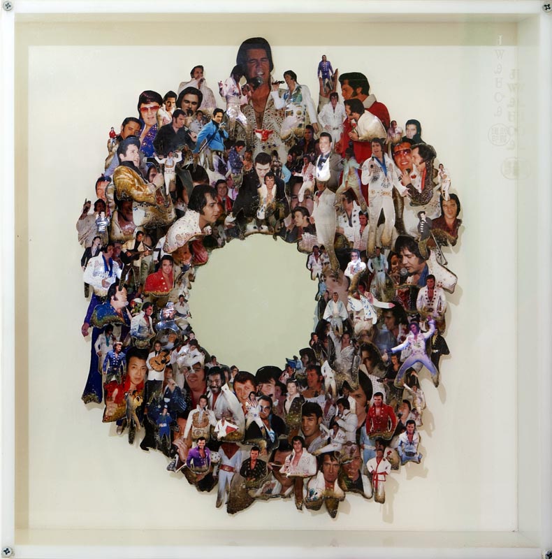 Burnt collage, plastic tips, mirror, etched plexi-glass vatrine.