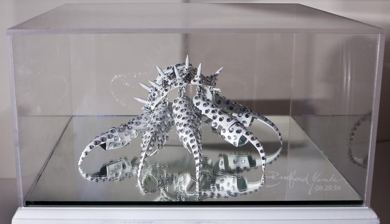 Painted metal, sequins, mirror, marble base, engraved plexi-glas