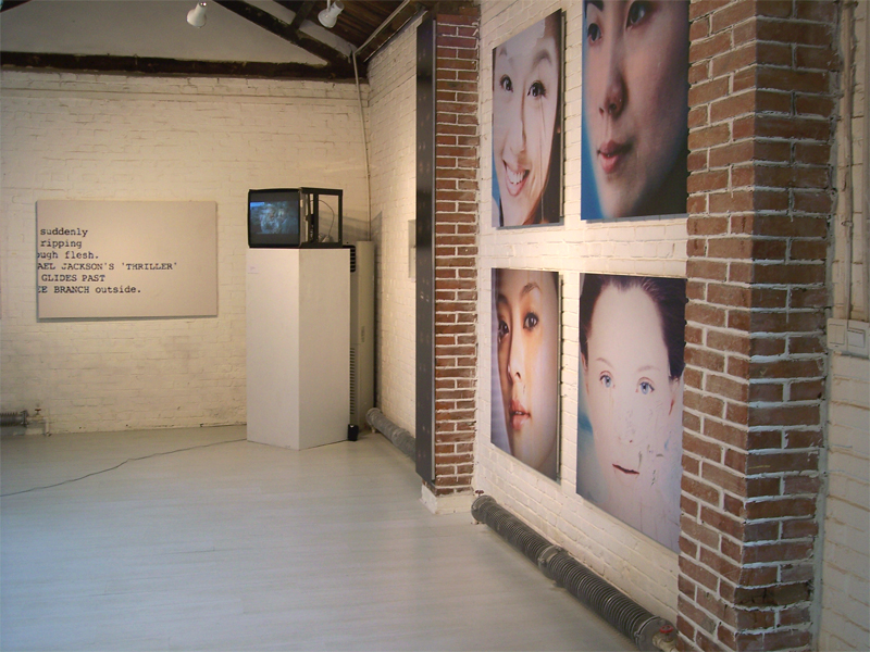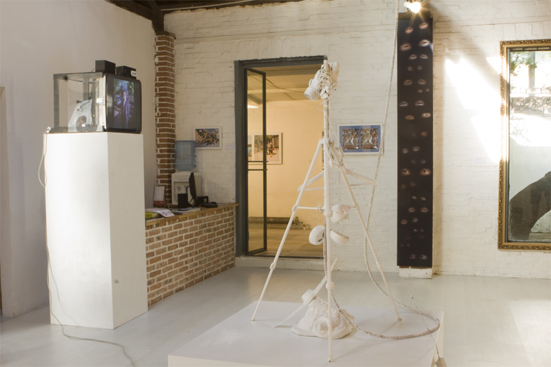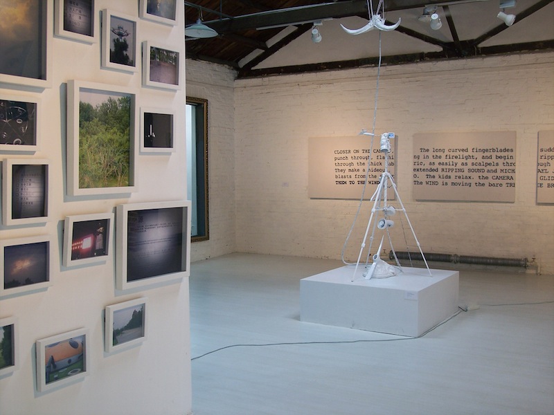 Tripod, video camera with lcd screen and in-camera effects, laser, paint, plywood, rubber, cast plaster, hanger, skull, steel, rope