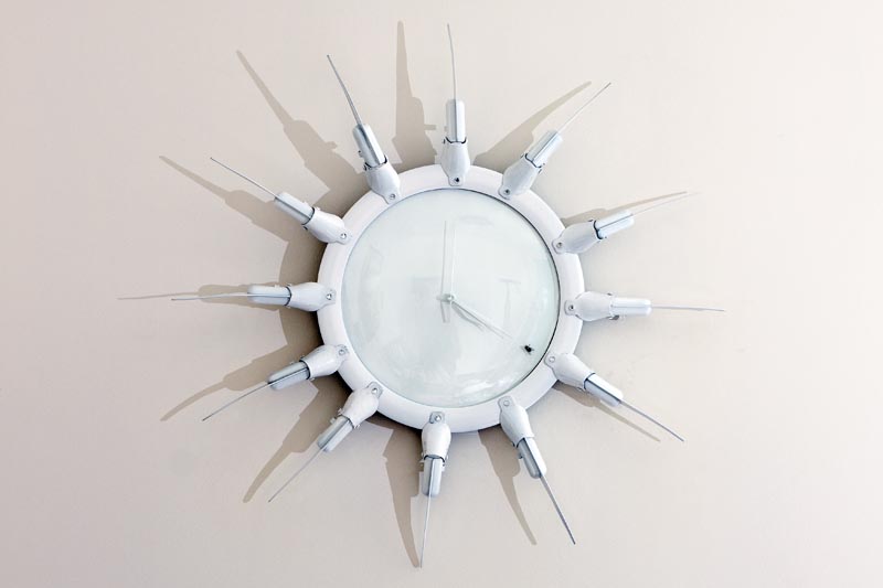 Plastic, sequined bolts, painted clock, fly